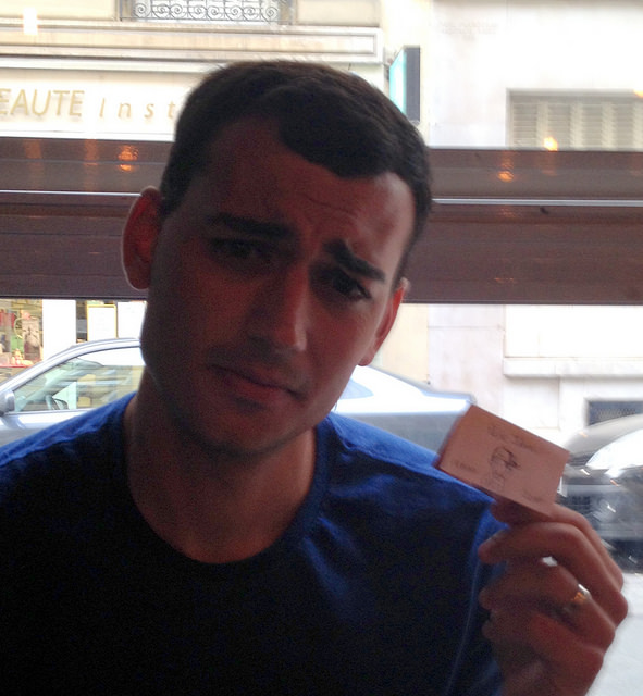 At this point, it was only 6:15 in the evening, but our poor American stomachs were calling out for dinner. I had read that like most Europeans, the French eat dinner much later than I’m used to. (Which to be honest, I would prefer to do at home, but Megan will never agree with me on that!) I had planned out most of the meals (of course) that we would have on the trip, and I had been able to make a few reservations online too. Tonight’s dinner at Tuk Tuk Thai was one of those reservations. Unfortunately, I made the reservation for 7:00pm. When we walked the lonnnng way to the restaurant on Rue de Laborde, we actually arrived on time. Nobody was there. Well, the restaurant staff members were there setting up for dinner, but no patrons were to be found. We decided to “read the menu” outside for about 5 minutes before actually entering the restaurant. We were seated at a table right by the window with a very cool hand-drawn “reservation card” on it.
