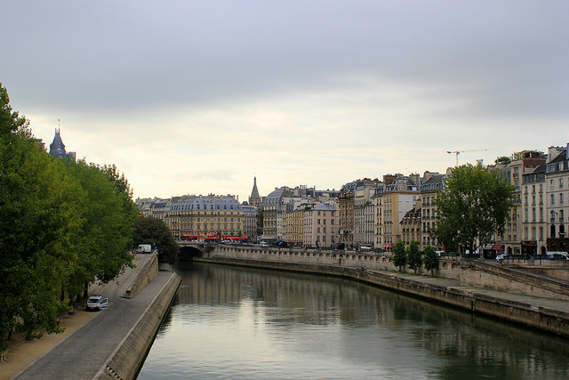 Looking upriver from Pont Neuf as the sun fights with the clouds